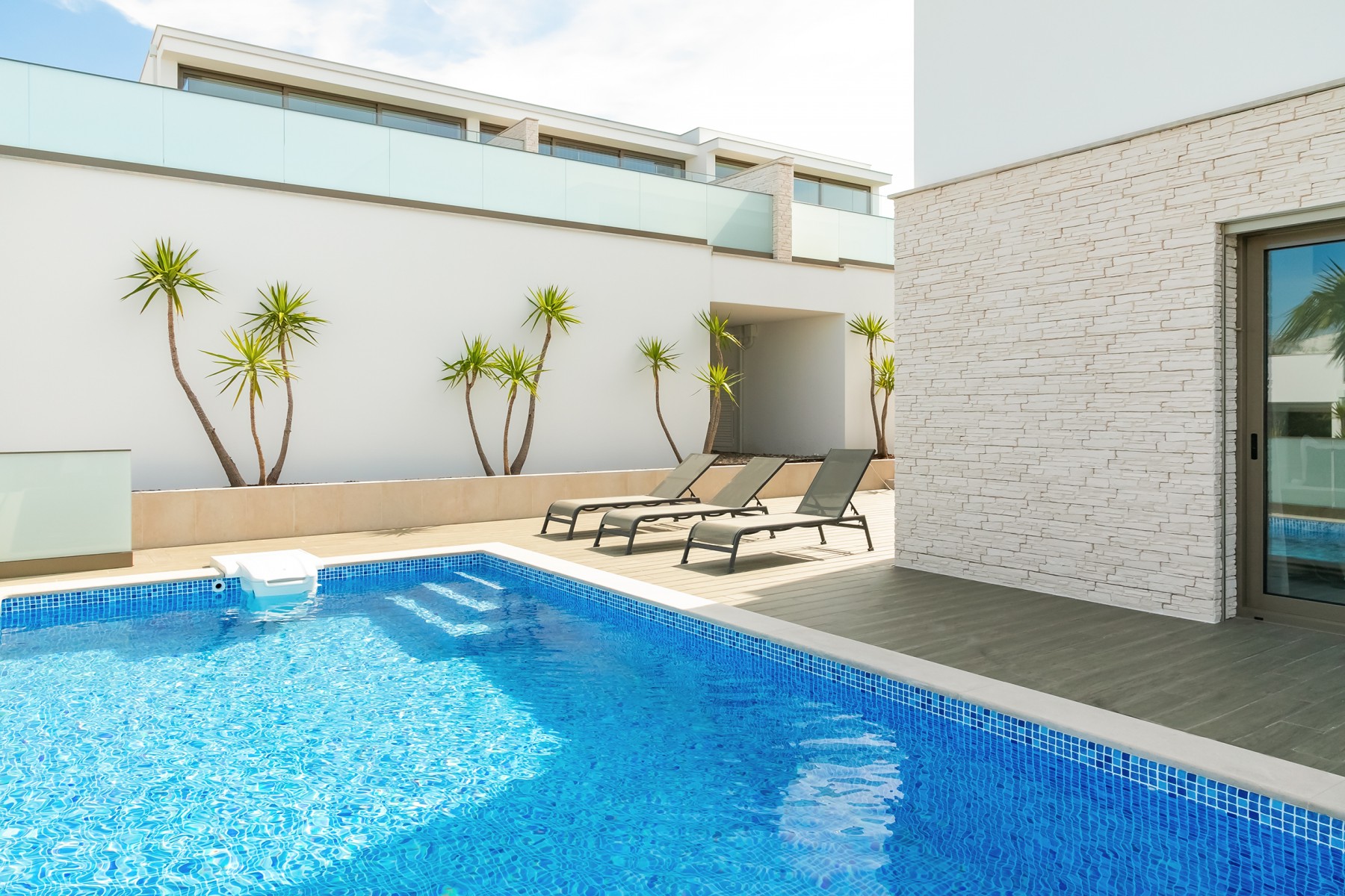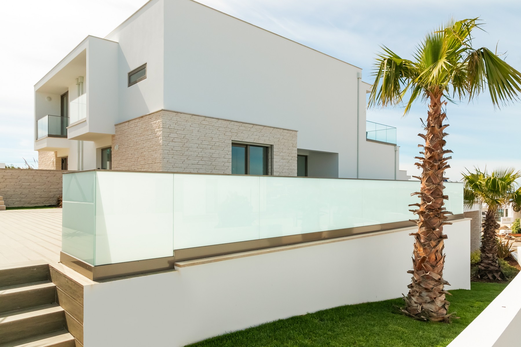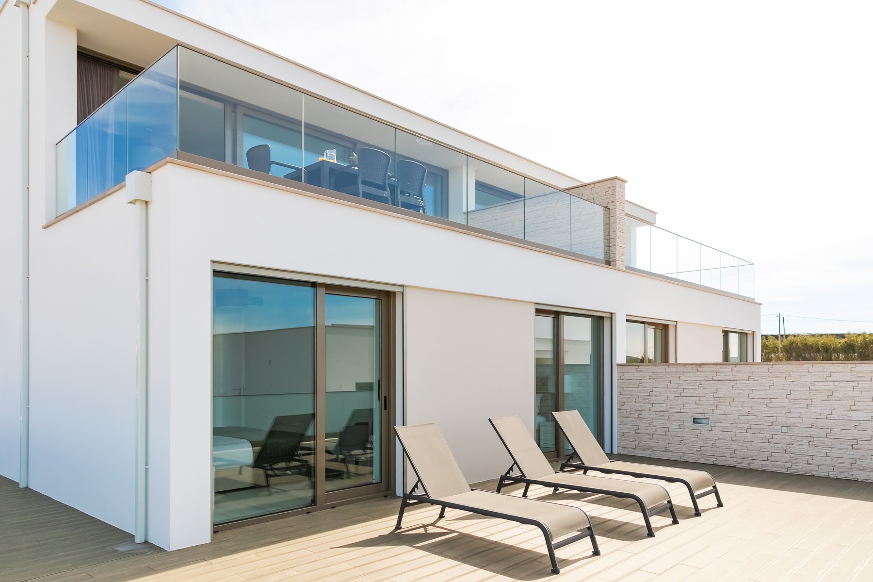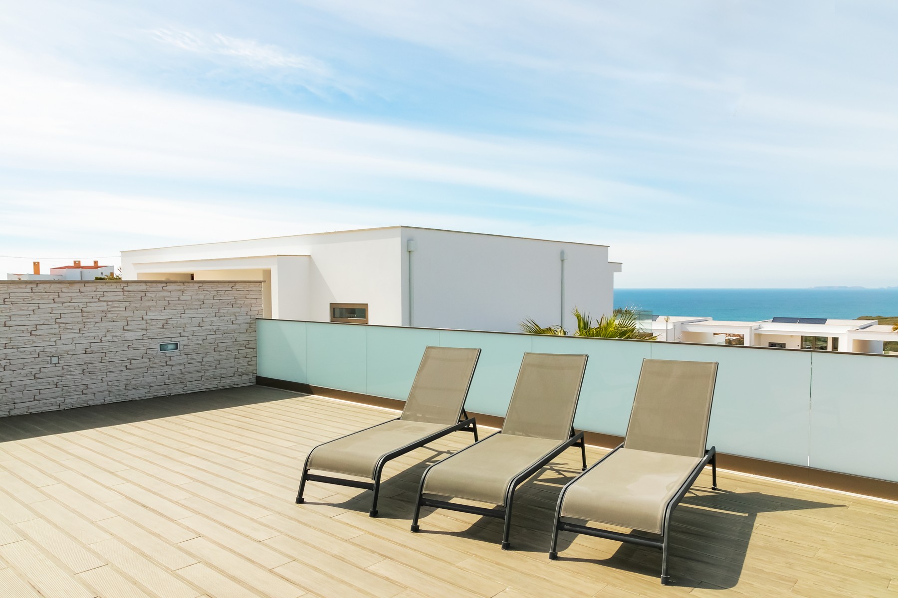 A moradia foi projetada de forma a tirar o máximo partido da magnífica vista panorâmica de mar com a sala e a cozinha no piso superior. As janelas panorâmicas grandes inundam a casa de luz em todos os pisos e o mar é um íman para o qual os olhos são atraídos de todos os ângulos. A cozinha de design, moderna e totalmente equipada tem tudo para tornar as refeições especiais e desfrutar de refeições ao ar livre no amplo terraço a observar o por do sol. No piso intermédio, encontra três quartos muito bem decorados com as suas casas de banho privativas em mármore e armários embutidos. Este piso abre para a piscina e o terraço - perfeito para relaxar ao sol.