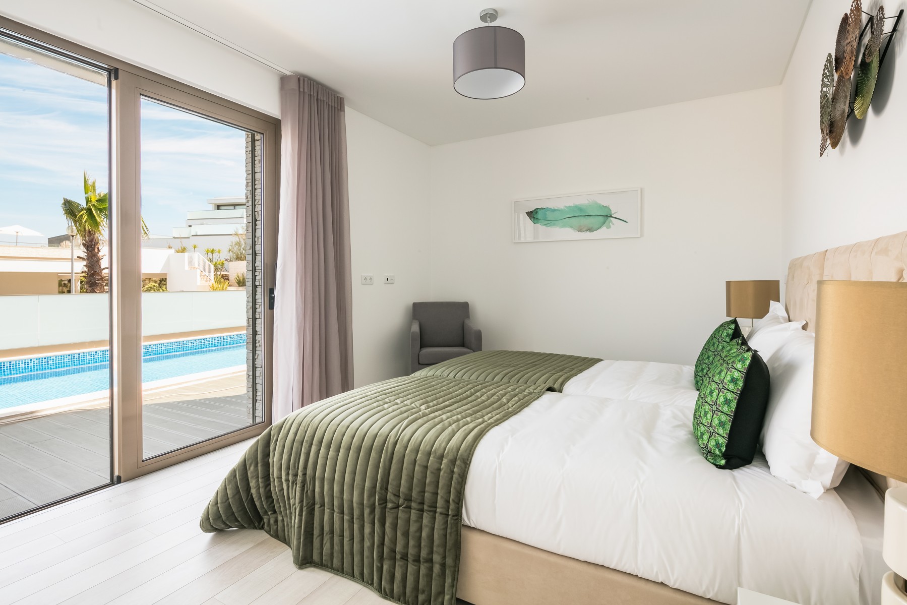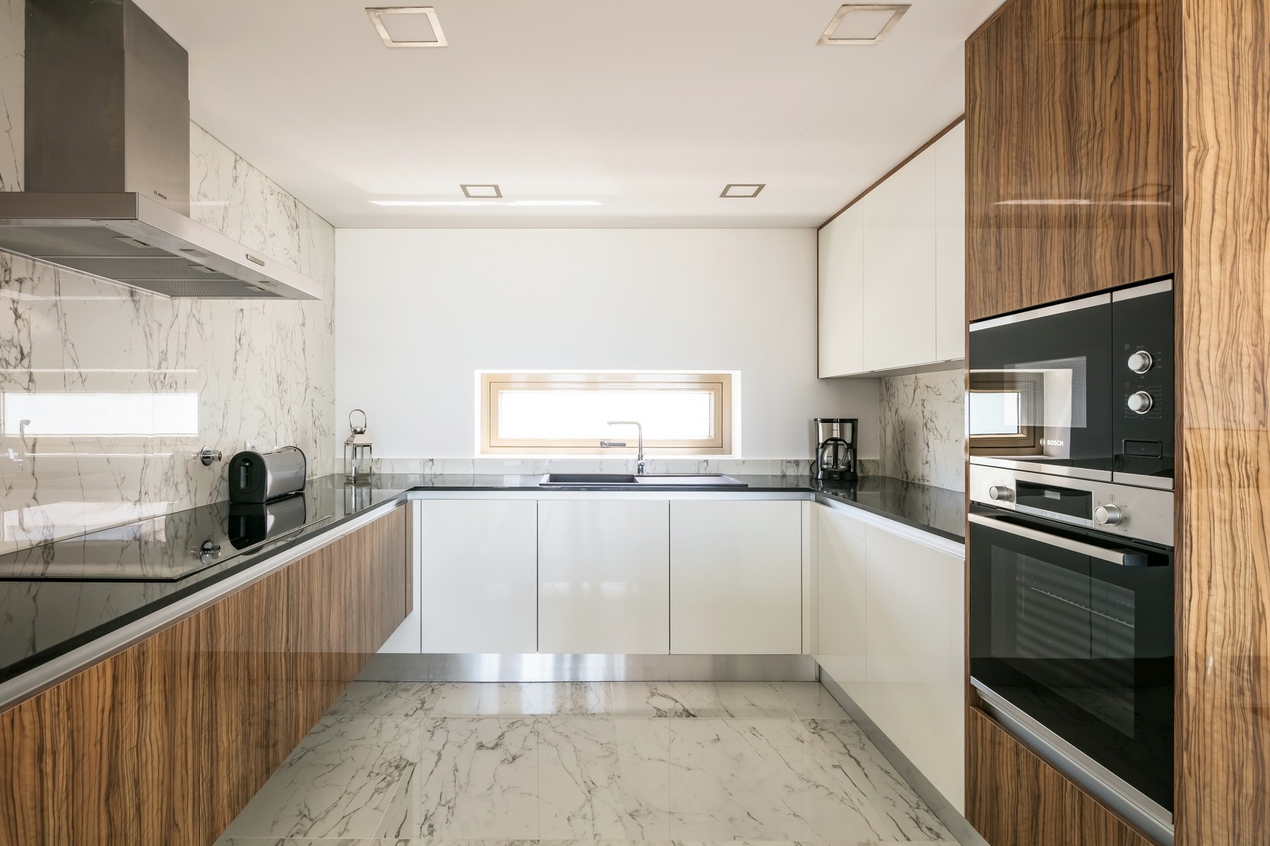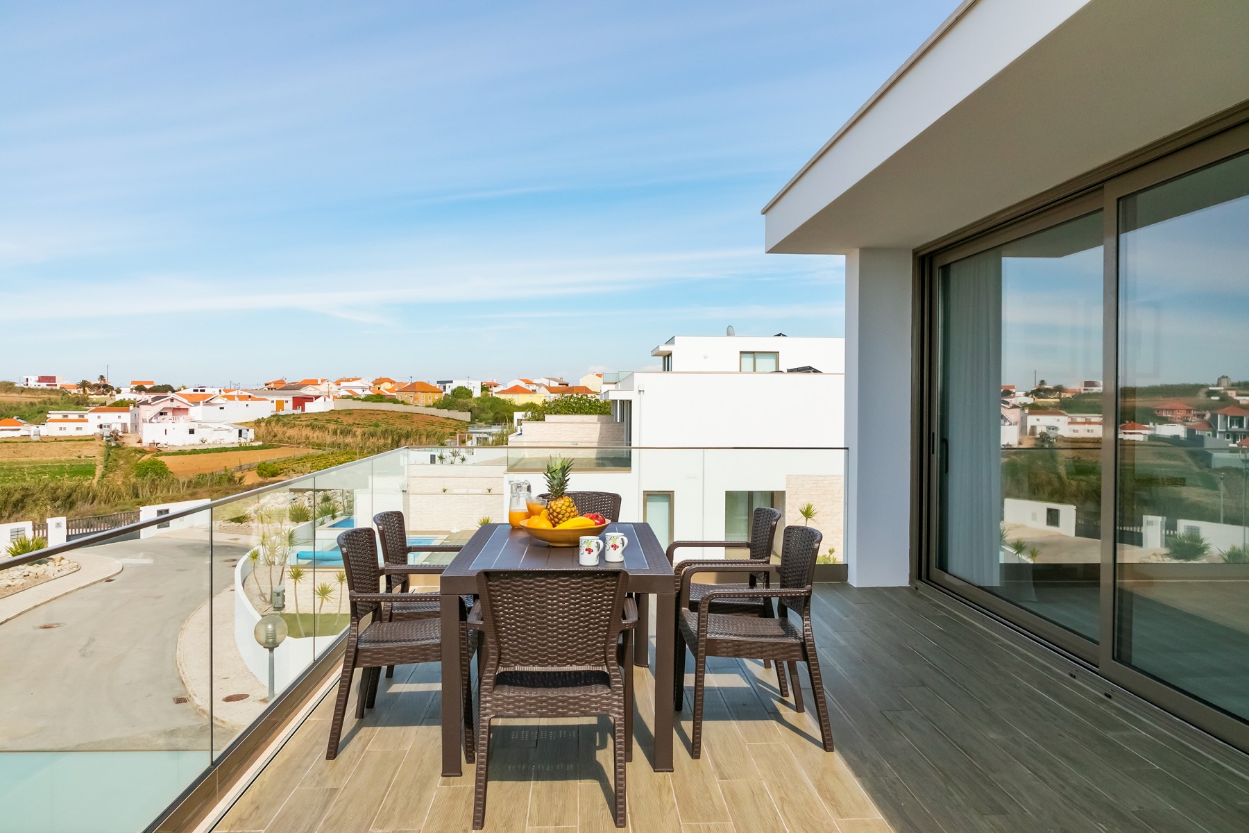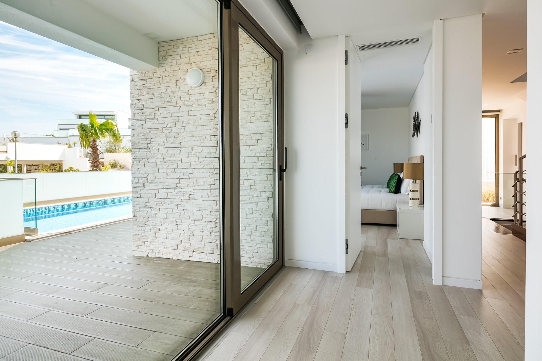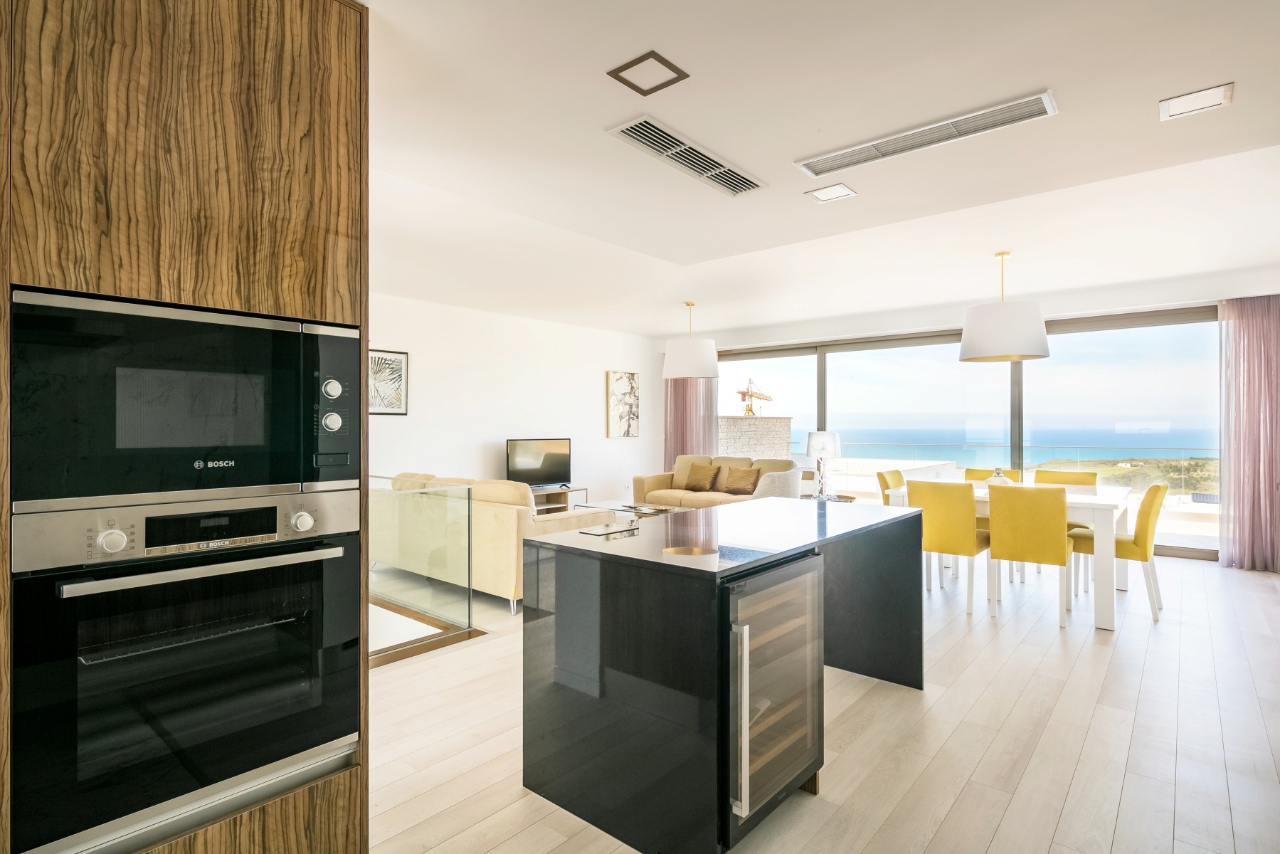 A moradia foi projetada de forma a tirar o máximo partido da magnífica vista panorâmica de mar com a sala e a cozinha no piso superior. As janelas panorâmicas grandes inundam a casa de luz em todos os pisos e o mar é um íman para o qual os olhos são atraídos de todos os ângulos. A cozinha de design, moderna e totalmente equipada tem tudo para tornar as refeições especiais e desfrutar de refeições ao ar livre no amplo terraço a observar o por do sol. No piso intermédio, encontra três quartos muito bem decorados com as suas casas de banho privativas em mármore e armários embutidos. Este piso abre para a piscina e o terraço - perfeito para relaxar ao sol.