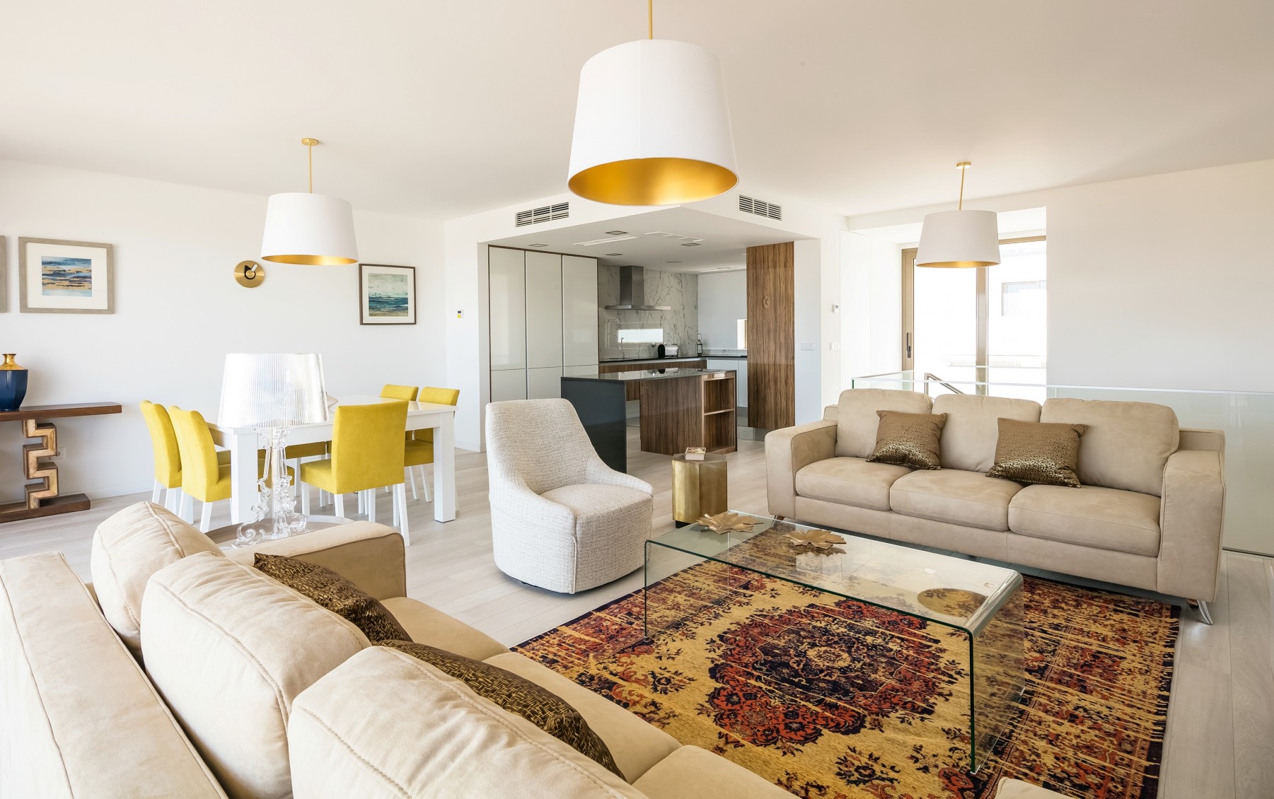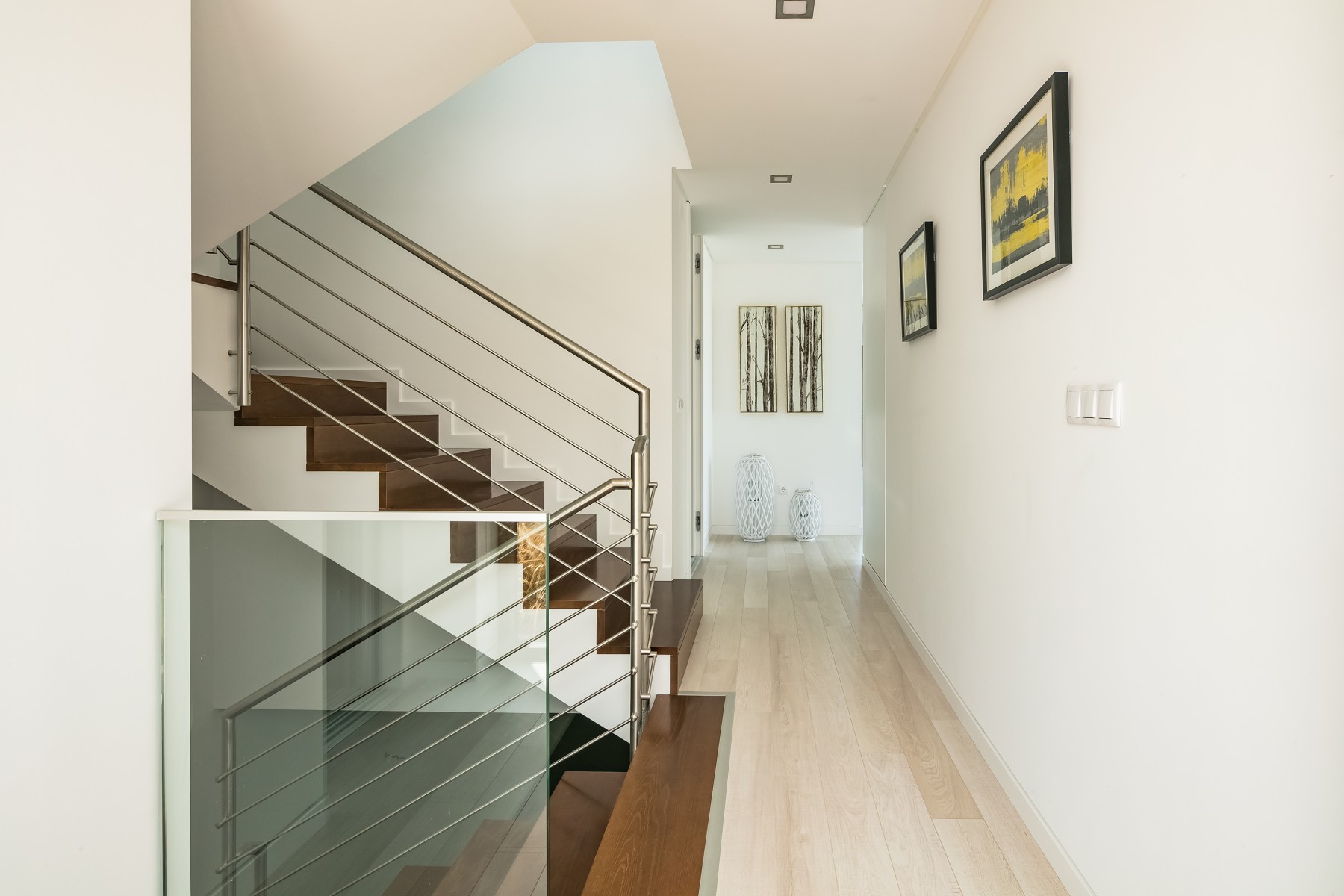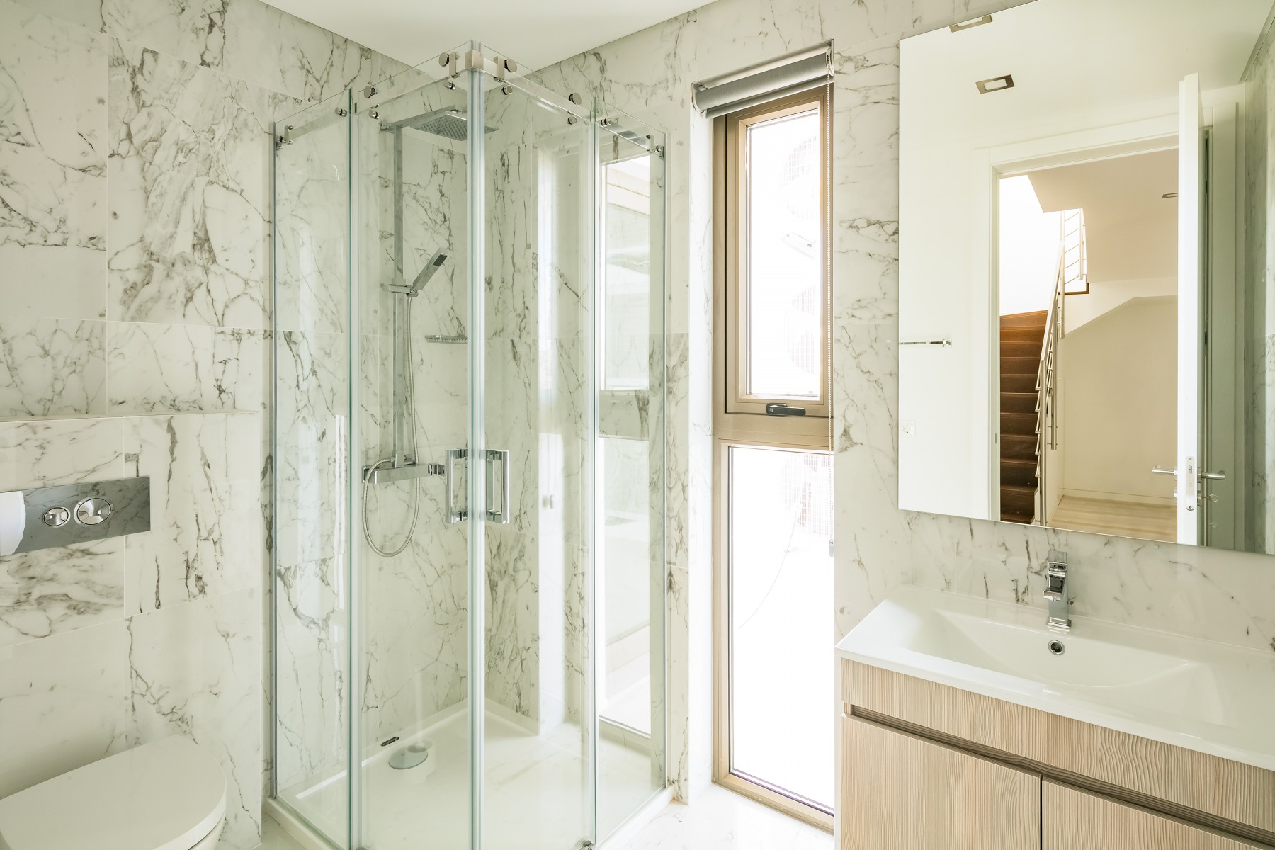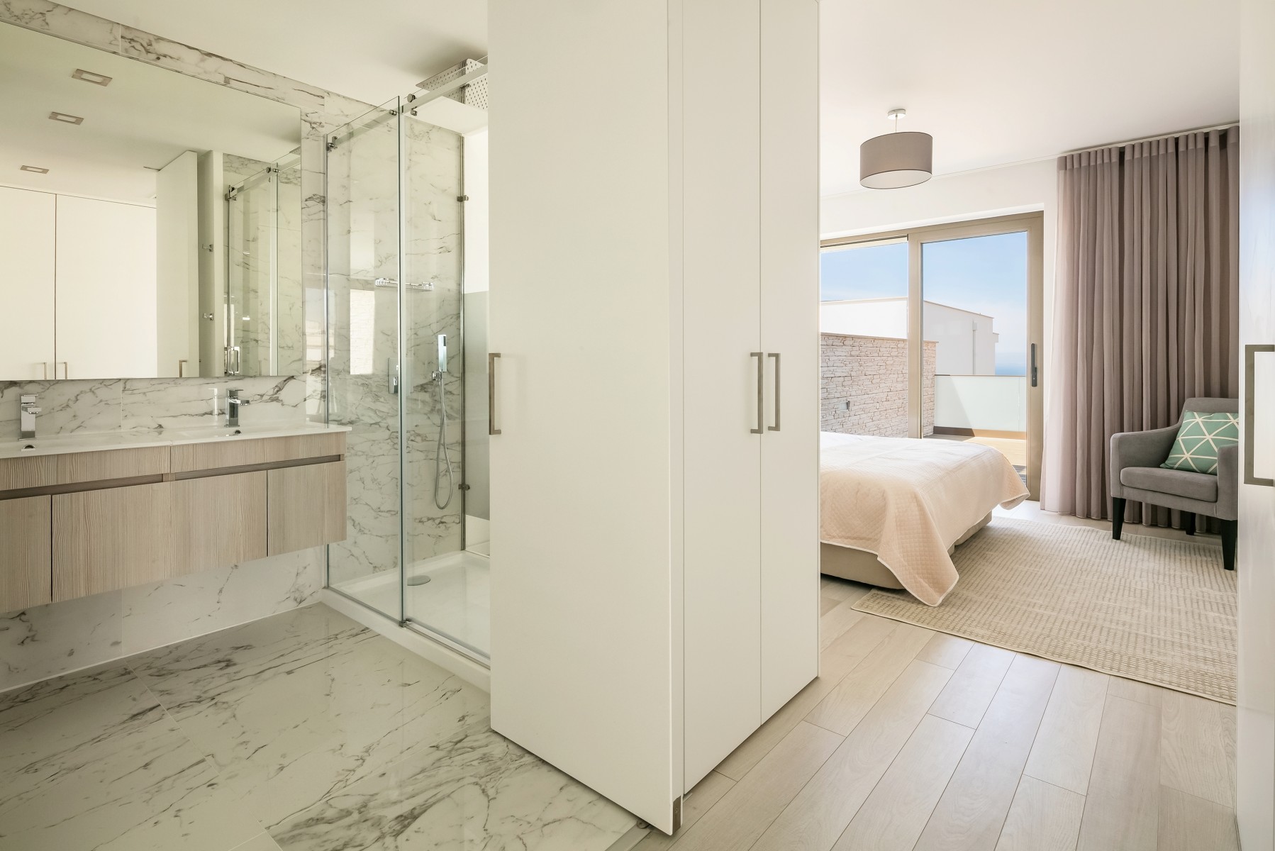 A moradia foi projetada de forma a tirar o máximo partido da magnífica vista panorâmica de mar com a sala e a cozinha no piso superior. As janelas panorâmicas grandes inundam a casa de luz em todos os pisos e o mar é um íman para o qual os olhos são atraídos de todos os ângulos. A cozinha de design, moderna e totalmente equipada tem tudo para tornar as refeições especiais e desfrutar de refeições ao ar livre no amplo terraço a observar o por do sol. No piso intermédio, encontra três quartos muito bem decorados com as suas casas de banho privativas em mármore e armários embutidos. Este piso abre para a piscina e o terraço - perfeito para relaxar ao sol.